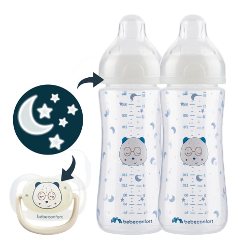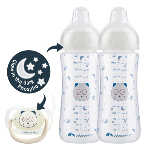 Glow-in-the-dark ringen op de grotere flessen en de fopspeen dragen bij aan het creëren van een rustige kalmerende omgeving voor je baby of peuter voor het slapen gaan.