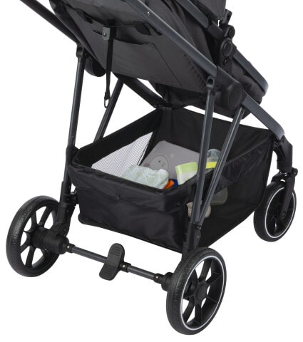 - De winkelmand met eenvoudige toegang kan belast worden tot maximaal 3 kg met boodschappen of benodigdheden voor de baby.